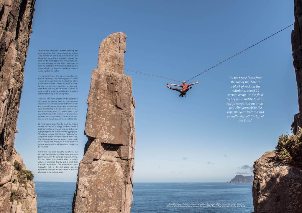 The Totem Pole, in the southeast corner of Tasmania, is one of the most epic settings for a rock climb. Roughly four metres wide on each side, this famous tower stands defiantly amid watery depths that swirl in a frenzy. It is inhospitable, yet mesmerising.